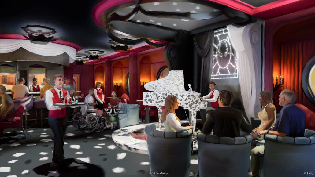 A brand-new piano lounge inspired by Cruella de Vil, the villain of Walt Disney Animation Studios’ One Hundred and One Dalmatians and the 2021 Cruella live-action film, is coming to the Disney Destiny. The over-the-top decor will be inspired by Cruella’s flair for style and bold attitude (of course!).