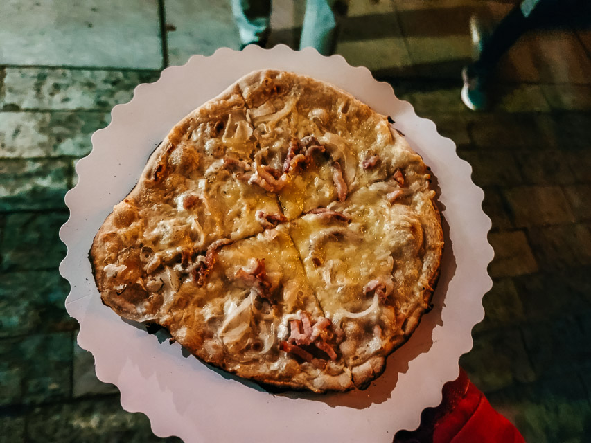 - Tarte Flambée : Similar to a pizza, this dish has a super thin crust that is usually wood-fired, topped with cream, onions, and ham or bacon.