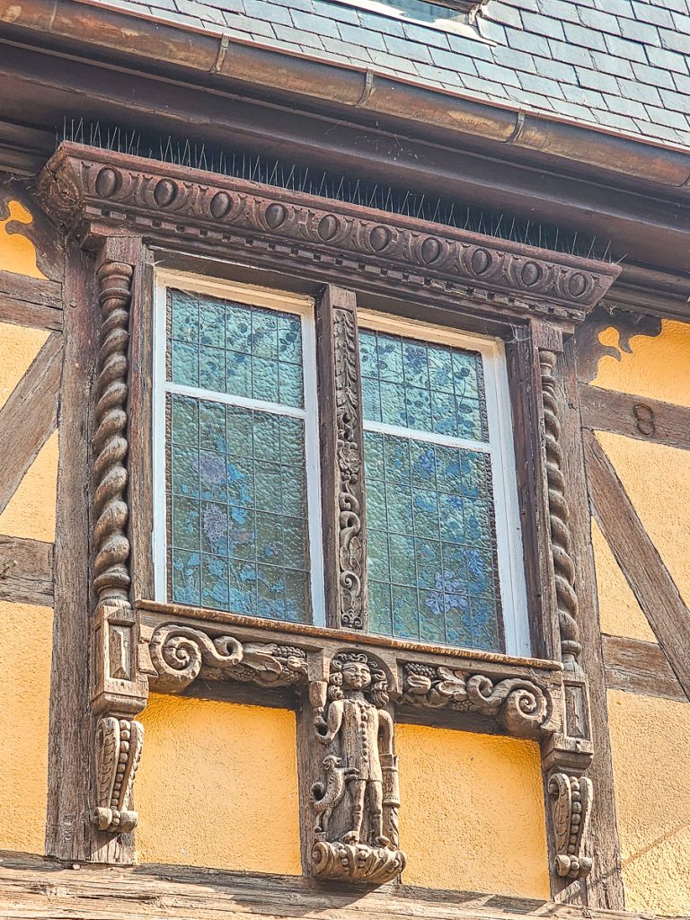 Maison Coutier, also known as the “Nailer’s House,” is one of the first homes in Riquewihr to feature sculpted corners and wooden figures built directly into the facade.