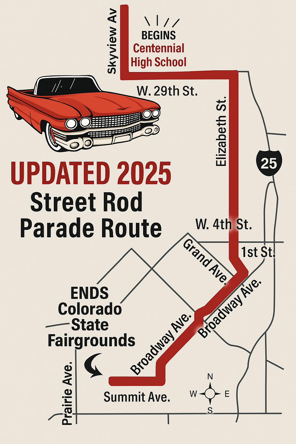 Starts at Centennial High School, 2525 Mountview Dr. | 10 a.m. | The Greater Pueblo Chamber of Commerce-led parade will head east on 29th Street, north on North Elizabeth, west on First Street and south on Grand Avenue to Union Avenue. The street rods will then turn left onto Abriendo Avenue, right on Broadway Avenue, left of Berkley Avenue and then right on Summit Avenue before heading west to the Colorado State Fairgrounds, 1001 Beulah Ave.
