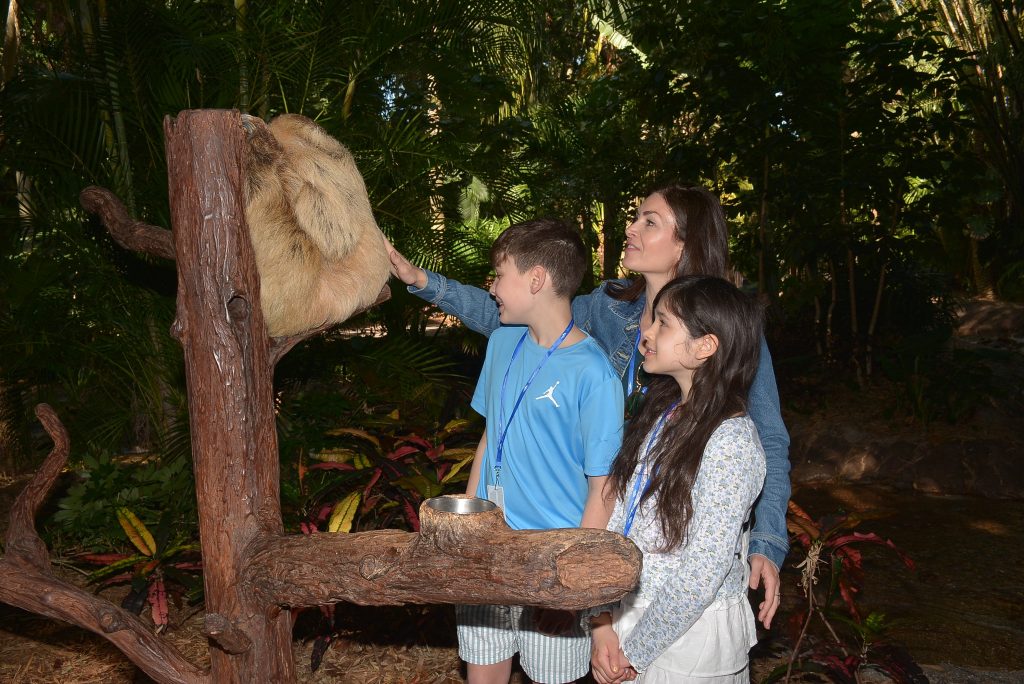 What I loved most about visiting Discovery Cove with my kids is that it is such a sensory experience: The park kept them offline and immersed in nature with hands-on learning. One of my son’s favorite animals is a sloth, and the three of us got to learn about and get close to Luey the sloth with a private 30-minute tour known as an Animal Trek . Ethan led us off the public pathways to meet our “animal ambassador,” a two-toed sloth, in the lush forest. My kids peppered the accompanying animal expert with questions (Question: “Can you cut a sloth’s nails?” Answer: “No, that’s how they climb and hang from trees.”). We were lucky enough to pet Luey while he was awake (sloths sleep between 15 and 20 hours a day).