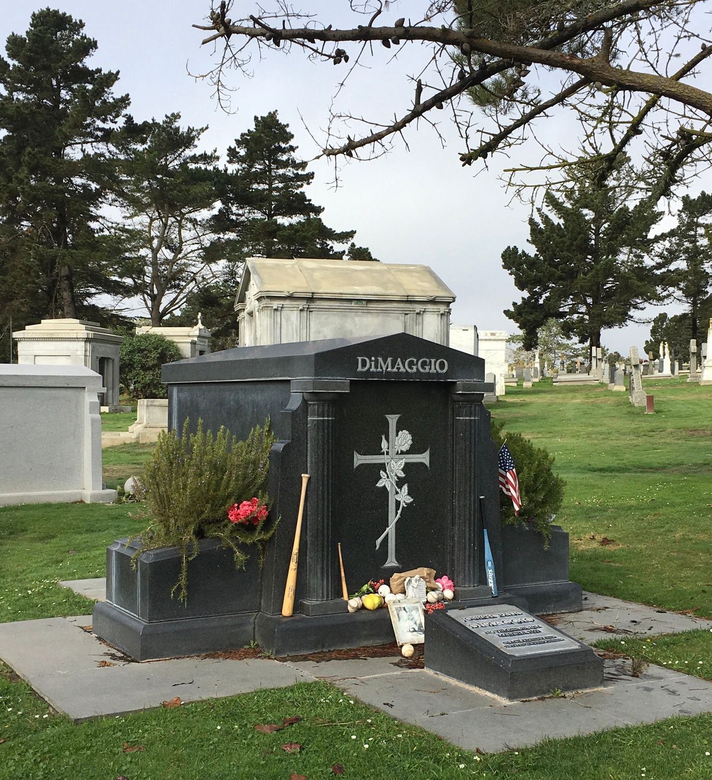 Heading south on El Camino Real from the Colma BART stop, the Hall of Famer and native San Franciscan is buried not in the Italian Cemetery, marked by a massive blue boot on the boundary wall, not in Woodlawn Memorial Park or Cypress Lawn where Lefty O’Doul and Willie McCovey are laid to rest, but in Holy Cross Catholic Cemetery. To get the Yankee Clipper’s final resting place you go up the long central drive, go around the Googie-stylized receiving chapel, and before the second rotary, turn left to find the patch of grass where DiMaggio’s handsome black marble headstone sits.