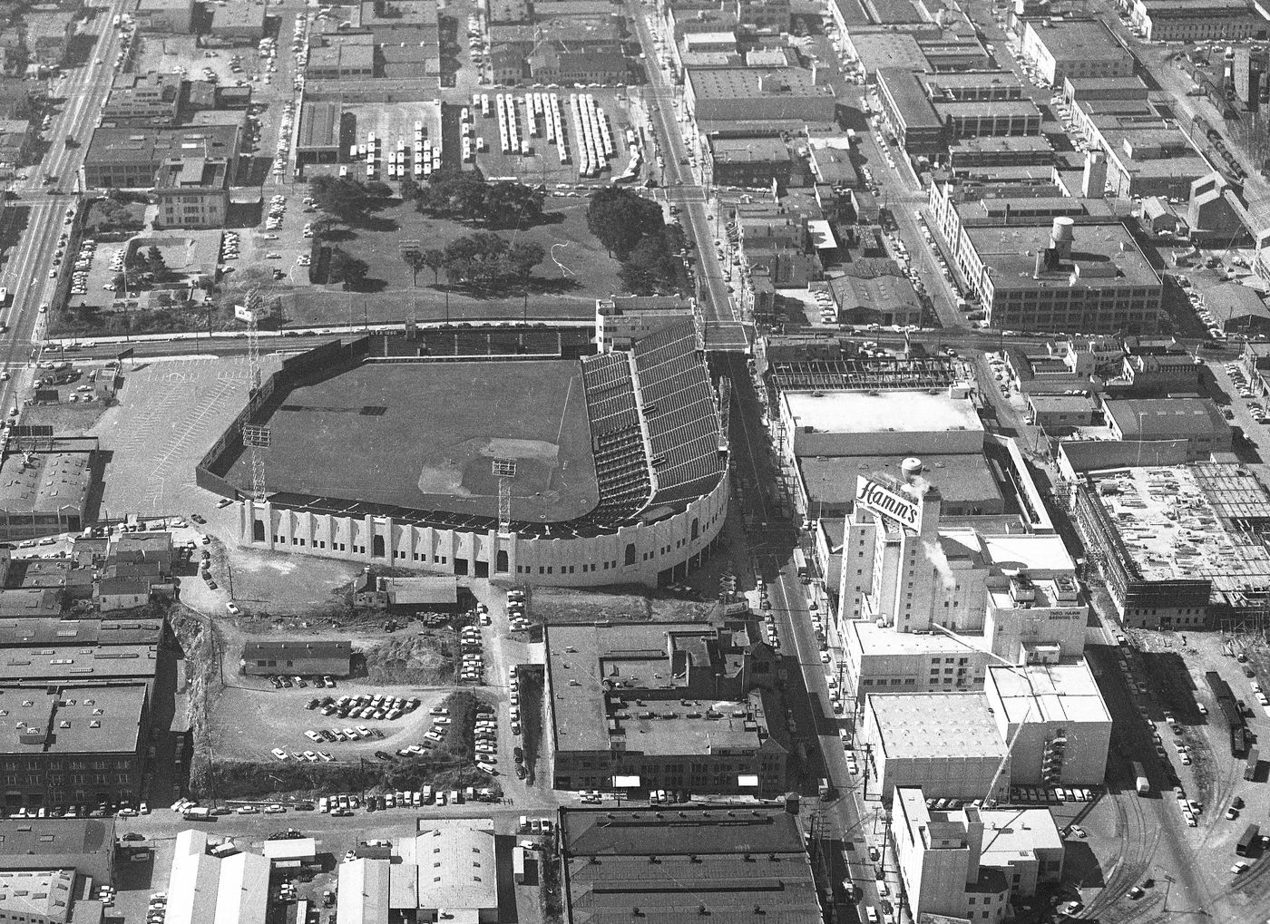 You can still walk these grounds — they just aren’t a baseball field anymore. There’s no rubber to toe or box to dig into, just cheap carpet or linoleum. Seals Stadium (opened in 1931), considered a crown jewel of PCL parks, was unceremoniously demolished two months after the 1959 season ended, gone the way of the first Recreation Park destroyed in the 1906 earthquake, Ewing Field, as ur-Candlestick, lost in the fog, the second “Big” Rec. Home plate was torn from the ground like a rooted tooth, the concrete grandstand razed, the right field wall and bleachers running along 16th street flattened and opened to traffic. The city block in the Potrero Hill neighborhood has been a shopping center for awhile now.