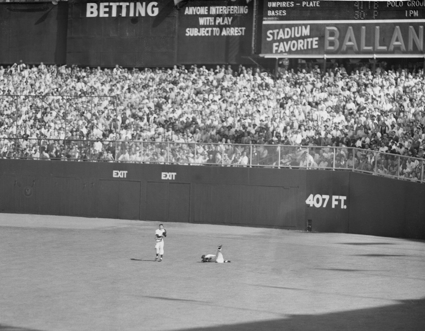 Limping and in pain from nagging injuries to his legs in that fateful ‘51, DiMaggio still patrolled center. The legend goes that Yankee manager Casey Stengal advised a young Mickey Mantle playing right-field to run down everything he could reach to ease the workload of the elder statesman. A brief that proved fateful when Mickey Mantle, chasing after a flyball to right-ish center, saw that DiMaggio had settled under it, pulled up short and tripped. A cleat caught on a half-buried piece of the sprinkler system, something popped in his knee, and he’d be sidelined for the rest of the series and play through pain, much like DiMaggio did, for the rest of his Hall of Fame career.