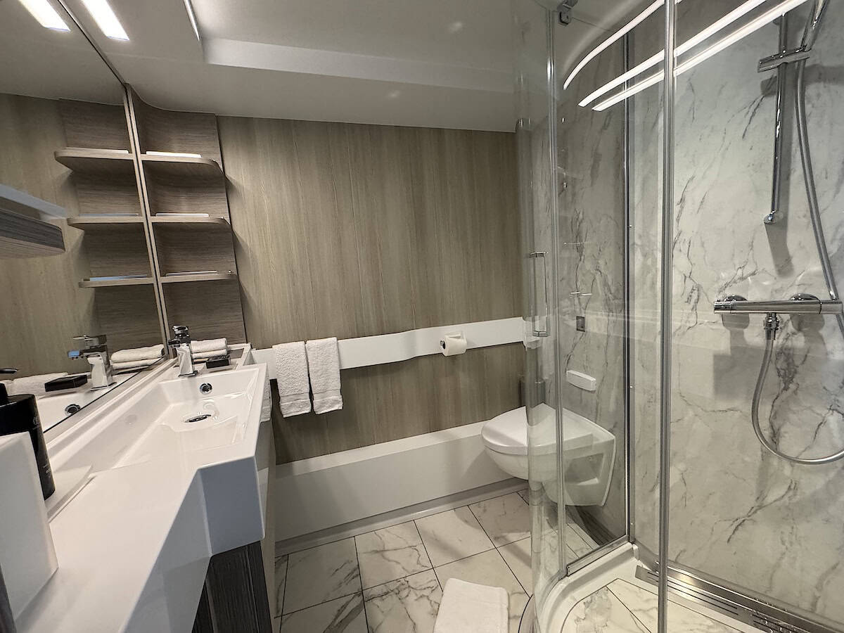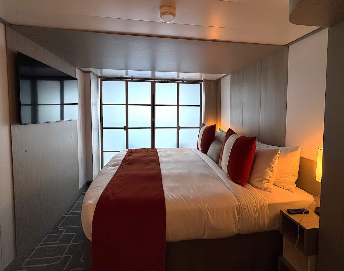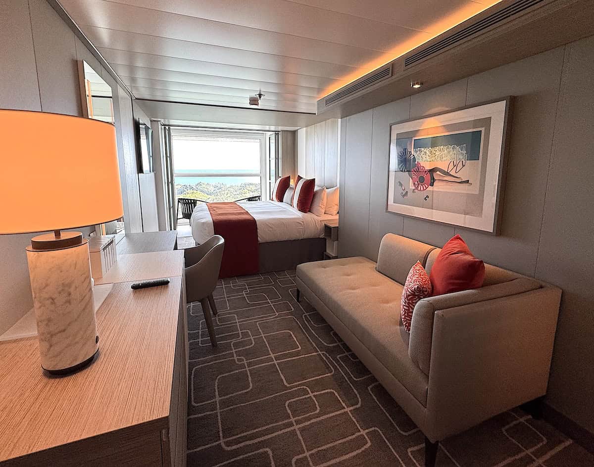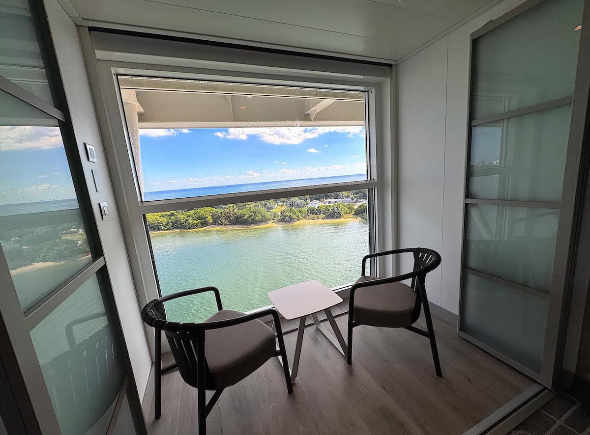 Sheckler Finch’s stateroom, 12169, on Deck 12 exceeded her expectations. The Infinite Balcony was a standout feature, with floor-to-ceiling windows that could be opened to let in sea air and ocean sounds. The balcony had French doors, blinds, two chairs, and a table, creating a peaceful and airy atmosphere.