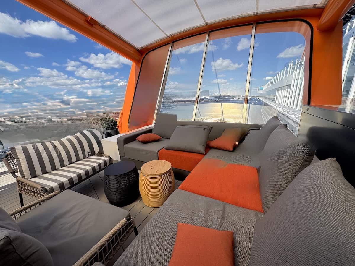 The Xcel pushes the industry-first concept even further, introducing seven new spaces and experiences. One of the highlights is the Magic Carpet, a vibrant tangerine-colored structure positioned on the side of the ship. About the size of a tennis court, this cantilevered floating platform serves multiple functions when the ship is not cruising, such as a dining spot, music performance venue, or tender platform.