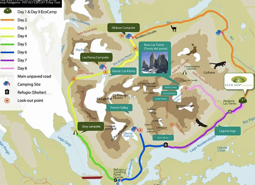The O Circuit, also known as the Paine Massif Circuit, is a 130 to 140km trek that takes 7 to 10 days to complete. It circles the entire Torres del Paine massif and includes the remote western backside of the park. The route is rated difficult to very difficult, featuring long distances between campsites, 4,000m of total elevation gain, and exposed passes.